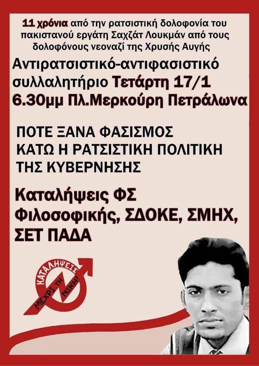 3) Συμμετέχουμε στην διαδήλωση για τα 11 χρόνια από τη δολοφονία του μετανάστη εργάτη Σαχζατ Λουκμαν από χρυσαυγιτες στα Πετράλωνα 17/01 6:30 Πλατεία Μερκούρη.