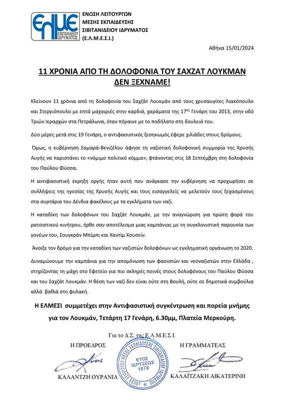Κλείνουν 11 χρόνια από τη δολοφονία του Σαχζάτ Λουκμάν από τους χρυσαυγίτες Λιακόπουλο και Στεργιόπουλο με επτά μαχαιριές στην καρδιά, χαράματα στις 17 Γενάρη του 2013, στην οδό Τριών Ιεραρχών στα Πετράλωνα, όταν πήγαινε με το ποδήλατο στη δουλειά του. Δύο μέρες μετά στις 19 Γενάρη, ο αντιφασιστικός ξεσηκωμός έφερε χιλιάδες στους δρόμους στην κινητοποίηση «Αθήνα πόλη αντιφασιστική». Όμως, η κυβέρνηση Σαμαρά-Βενιζέλου άφησε τη ναζιστική δολοφονική συμμορία της Χρυσής Αυγής να παριστάνει το «νόμιμο πολιτικό κόμμα», φτάνοντας στις 18 Σεπτέμβρη στη δολοφονία του Παύλου Φύσσα.