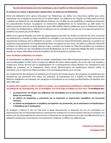 Η νεολαία της Παλαιστίνης καλεί στις 31.12.2023 σε μια στήριξη στον καταπιεσμένο λαό της Παλαιστίνης, που αυτή τη στιγμή είναι κάτω από συνεχή πολιορκία από τις ισραηλινές δυνάμεις, αντιμέτωπος με μια φανερή γενοκτονία. Ζητούν από τον κόσμο να αφυπνιστεί και να αναλάβει πρωτοβουλιακές δράσεις, από οργανωμένες πορείες μέχρι και την ύψωση της Παλαιστινιακής σημαίας.