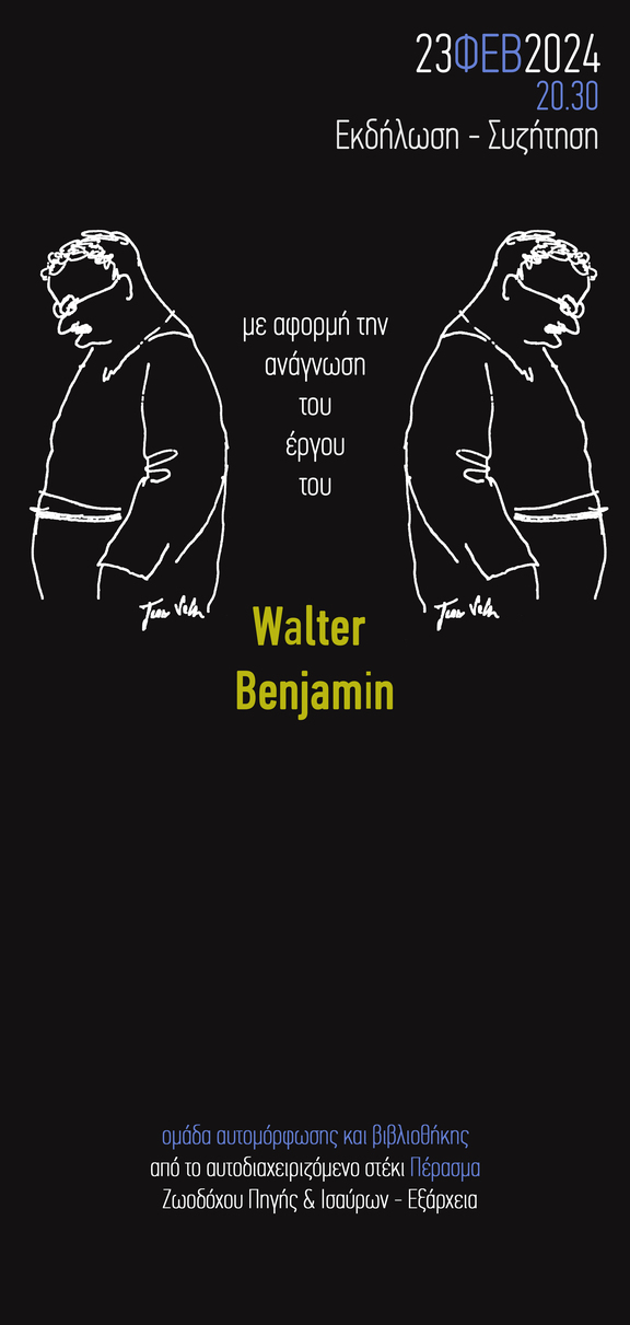 Με αφορμή την σχετικά πρόσφατη ανάγνωση μέρους του έργου του Walter Benjamin η ομάδα Αυτομόρφωσης και Δανειστικής Βιβλιοθήκης σας προσκαλεί στην ανοιχτή μας εκδήλωση - συζήτηση την Παρασκευή 23 Φεβρουαρίου 2024 8.30μμ στο Αυτοδιαχειριζόμενο στέκι Πέρασμα (Ζωοδόχου Πηγής και Ισαύρων, Εξάρχεια).