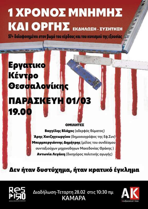 Η δικαίωση του αδερφών μας και η στήριξη των συγγενών τους είναι υπόθεση που μας αφορά όλους/ες και ό,τι είναι να γίνει θα επιτευχθεί με την δική μας αλληλεγγύη, αλληλοβοήθεια και την ενεργό παρουσία. Κι αν έτσι έχουν τα πράγματα, χωρίς τον άμεσο και ενεργό κοινωνικό έλεγχο στην οργανωμένη ζωή και στα μέσα που διαθέτει όπως ο σιδηρόδρομος, πάντα θα βρισκόμαστε αντιμέτωποι/ες με το οργανωμένο έγκλημα ενός πολιτικού και οικονομικού συστήματος που αναπτύσσεται λεηλατώντας και αναλώνοντας ανθρώπους και φύση.