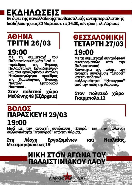 Ο Διαρκής Αγώνας για την ταξική απελευθέρωση, εν όψει της πανελλαδικής/πανθεσσαλικής αντι-ιμπεριαλιστικής διαδήλωσης στις 30 Μαρτίου στη Λάρισα, διοργανώνει ανοιχτή εκδήλωση-συζήτηση στον πολιτικό χώρο στην Μεθώνης 48 (Εξάρχεια), με τη συμμετοχή του Μιχιάρ Εκτεμί, προέδρου της Ένωσης Παλαιστίνιων Εργαζομένων και του Αντώνη Νταλακογιώργου, προέδρου της Πανελλήνιας Ένωσης Ναυτών του Εμπορικού Ναυτικόυ (ΠΕΝΕΝ).