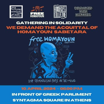 Θα συγκεντρωθούμε στις 6μμ στην πλατεία Συντάγματος στην Αθήνα για να απαιτήσουμε την αθώωση του Homayoun Sabetara και να δείξουμε ότι αυτό που συμβαίνει σε τέτοια δικαστήρια μας αφορά! Θα συγκεντρωθούμε και θα φωνάξουμε για την ελευθερία του Homayoun και όλων των μεταναστ(ρι)ών που μετακινούνται και ποινικοποιούνται βάσει των εθνικών και ευρωπαϊκών νόμων περί «διακίνησης μεταναστών».