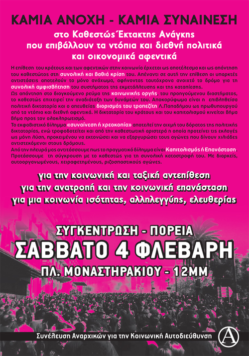 Απέναντι σε αυτή τη συνθήκη είναι ανάγκη να ξεπεράσουμε τις φοβίες και τους εκβιασμούς. Να μην δεχτούμε ούτε την επιστροφή στη μιζέρια που υπήρχε πριν την κρίση, ούτε και την εξαθλίωση που βιώνουμε τώρα και θα χειροτερέψει στο μέλλον. Να αγωνιστούμε συλλογικά, αυτοοργανωμένα και αλληλέγγυα απέναντι στο υπάρχον, δημιουργώντας και ενισχύοντας οριζόντιες αντιιεραρχικές και ακηδεμόνευτες εστίες αντίστασης στους χώρους εργασίας, εκπαίδευσης και στις γειτονιές, συγκρουόμενοι με το κράτος και τον καπιταλισμό. Να σταματήσουμε να μιλάμε τη γλώσσα της εξουσίας, να φανταστούμε και να θέσουμε οι ίδιοι/ες τα περιεχόμενα και τους όρους της ζωής που θέλουμε.