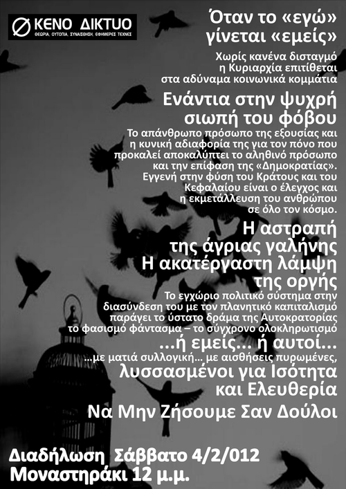 It is our duty not to remain a sum of unaffiliated individualities who meekly obey the plans of the State and the bosses; not to succumb to their cock-and-bull stories about 'salvation of the fatherland', 'debts that are weighing us down', neither to blackmailing dilemmas such as 'consent or bankruptcy', 'euro or drachma' that they use in order to maintain their dominion.