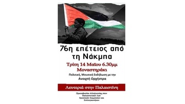 Στο πλαίσιο αυτό οργανώνει στις 14 Μάη, με αφορμή την επέτειο για τα 76 χρόνια της Νάκμπα, πολιτική και καλλιτεχνική εκδήλωση στο Μοναστηράκι (14/5 ώρα 6.30).