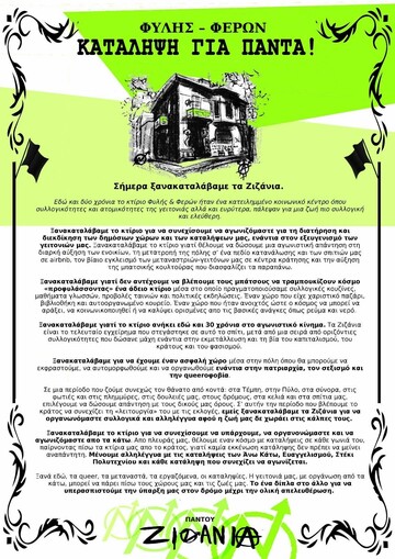 Σήμερα ξανακαταλάβαμε τα Ζιζάνια.Εδώ και δύο χρόνια το κτίριο Φυλής & Φερών ήταν ένα κατειλημμένο κοινωνικό κέντρο όπου συλλογικότητες και ατομικότητες της γειτονιάς αλλά και ευρύτερα, πάλεψαν για μια ζωή πιο συλλογική και ελεύθερη.ΟΙ ΓΕΙΤΟΝΙΕΣ ΜΑΣ ΓΙΑ ΟΛΑ.Ξανακαταλάβαμε το κτίριο για να συνεχίσουμε να αγωνιζόμαστε για τη διατήρηση και διεκδίκηση των δημόσιων χώρων και των καταλήψεων μας, ενάντια στον εξευγενισμό των γειτονιών μας.Ξανακαταλάβαμε το κτίριο γιατί θέλουμε να δώσουμε μια αγωνιστική απάντηση στη διαρκή αύξηση των ενοικίων,τη μετατροπή της πόλης σ' ένα πεδίο κατανάλωσης και των σπιτιών μας σε airbnb,τον βίαιο εγκλεισμό των μεταναστριών-γειτόνων μας σε κέντρα κράτησης και την αύξηση της μπατσικής κουλτούρας που διασφαλίζει τα παραπάνω.Ξανακαταλάβαμε γιατί δεν αντέχουμε να βλέπουμε τους μπάτσους να τραμπουκίζουν κόσμο «προφυλάσσοντας» ένα άδειο κτίριο μέσα στο οποίο πραγματοποιούσαμε συλλογικές κουζίνες, μαθήματα γλωσσών, προβολές ταινιών και πολιτικές εκδηλώσεις.Έναν χώρο που είχε χαριστικό παζάρι, βιβλιοθήκη και αυτοοργανωμένο κουρείο.Έναν χώρο που ήταν ανοιχτός ώστε ο κόσμος να μπορεί να αράξει, να κοινωνικοποιηθεί ή να καλύψει ορισμένες απο τις βασικές ανάγκες όπως ρεύμα και νερό.Ξανακαταλάβαμε γιατί το κτίριο ανήκει εδώ και 30 χρόνια στο αγωνιστικό κίνημα.Τα Ζιζάνια είναι το τελευταίο εγχείρημα που στεγάστηκε σε αυτό το σπίτι, μετά από μια σειρά από οριζόντιες συλλογικότητες που δώσανε μάχη ενάντια στην εκμετάλλευση και τη βία του καπιταλισμού, του κράτους και του φασισμού.Ξανακαταλάβαμε για να έχουμε έναν ασφαλή χώρο μέσα στην πόλη όπου θα μπορούμε να εκφραστούμε, να αυτομορφωθούμε και να οργανωθούμε ενάντια στην πατριαρχία, τον σεξισμό και την queeroφοβία.Σε μια περίοδο που ζούμε συνεχώς τον θάνατο από κοντά: στα Τέμπη, στην Πύλο, στα σύνορα, στις φωτιές και στις πλημμύρες, στις δουλειές μας, στους δρόμους, στα κελιά και στα σπίτια μας, επιλέγουμε να δώσουμε απάντηση με τους δικούς μας όρους. Σ' αυτήν την περίοδο που βλέπουμε το κράτος να συνεχίζει τη «λειτουργία» του με τις εκλογές, εμείς ξανακαταλάβαμε τα Ζιζάνια για να οργανωνόμαστε συλλογικά και αλληλέγγυα αφού η ζωή μας δε χωράει στις κάλπες τους.Ξανακαταλάβαμε το κτίριο για να συνεχίσουμε να υπάρχουμε, να οργανονώμαστε και να αγωνιζόμαστε απο τα κάτω.Απο πλευράς μας, θέλουμε εναν κόσμο με καταλήψεις σε κάθε γωνιά του, παίρνοντας πίσω τα κτίρια μας απο το κράτος, γιατί καμία εκκένωση κατάληψης δεν πρέπει να μείνει αναπάντητη.Μένουμε αλληλέγγυα με τις καταλήψεις των Άνω Κάτω, Ευαγγελισμού, Στέκι Πολυτεχνίου και κάθε κατάληψη που συνεχίζει να αγωνίζεται.Ξανά εδώ, τα queer, τα μεταναστά, τα εργαζόμενα, οι καταληψίες.Η γειτονιά μας, με οργάνωση από τα κάτω, μπορεί να πάρει πίσω τους χώρους μας και τις ζωές μας. Το ένα δίπλα στο άλλο για να υπερασπιστούμε την ύπαρξη μας στον δρόμο μέχρι την ολική απελευθέρωση. ΖΙΖΑΝΙΑ ΠΑΝΤΟΥ