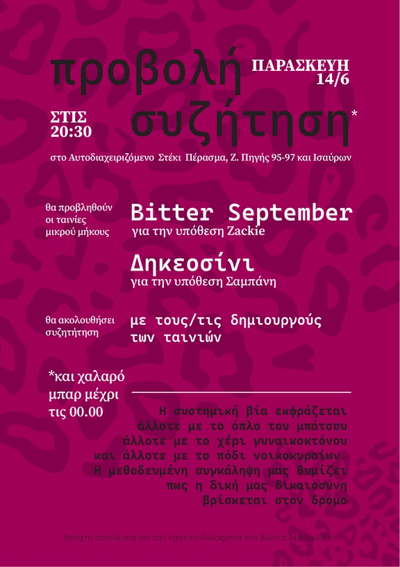 Προβολή των ταινιών μικρού μήκους Bitter September (για την υπόθεση Zackie) Δηκεοσίνι (για την υπόθεση Σαμπάνη) και συζήτηση με τις/τους δημιουργούς. Θα πραγματοποιήθει ενημέρωση και για την υπόθεση της κρατικής δολοφονίας του Κ. Μανιουδάκη. Θα ακολουθήσει χαλαρό μπαρ ως τις 00:00. Στο Αυτοδιαχειριζόμενο Στέκι Πέρασμα, Ζωοδόχου Πηγής 95-97 & Ισαύρων, Εξάρχεια.