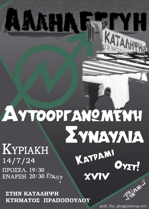 Την Κυριακή 14 Ιουλίου μαζευόμαστε στην κατάληψη του κτήματος Πραποπούλου παρέα με τους Κατράμι, τους γερό Ουστ και τον XVIV για να προετοιμαστούμε για τα δεινά που θα περάσουμε και αυτό το καλοκαίρι. Μουσική θα έχουμε, αυτοοργανωμένη μπύρα και μη θα έχουμε άρα ελάτε από νωρίς μπας και κοιμηθούμε και καθόλου.