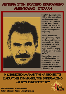 Ο αγώνας για την απελευθέρωση του Οτσαλάν είναι μια πράξη αλληλεγγύης προς, τον καταπιεσμένο κουρδικό λαό, το αντάρτικο στα βουνά του Κουρδιστάν, την επανάσταση στη Ροζάβα ΒΑ Συρία, που χτυπιούνται καθημερινά από μπόμπες και χημικά όπλα.