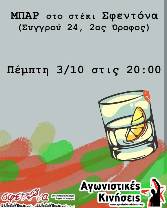 Οι Αγωνιστικές Κινήσεις σας καλούμε στο μπαρ που διοργανώνουμε την Πέμπτη 3/10 στο στέκι μας.