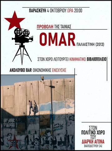 Την Παρασκευή 4/10 στις 20:00 στον πολιτικό χώρο του Διαρκή Αγώνα (Καποδιστρίου 22-24) θα πραγματοποιηθεί προβολή της ταινίας "OMAR" - Παλαιστίνη (2013). Στον χώρο λειτουργεί και κινηματικό βιβλιοπωλείο. Μετά την προβολή, θα ακολουθήσει BAR οικονομικής ενίσχυσης.