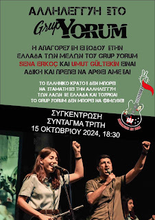 Στις 15 Οκτωβρίου 2024, στις 18:30, καλούμε συγκέντρωση στην πλατεία ΣΥΝΤΑΓΜΑΤΟΣ για την άρση της απαγόρευσης εισόδου στα μέλη του Grup Yorum Sena Erkoç και Umut Gültekin!
