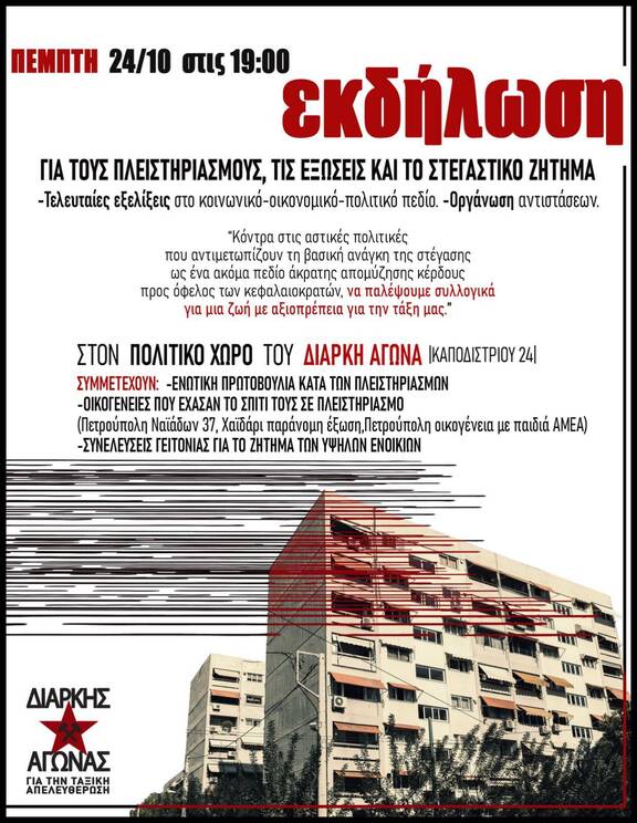 Την Πέμπτη 24.10, στις 19.00, στον πολιτικό χώρο του Διαρκή Αγώνα για την ταξική απελευθέρωση στα Εξάρχεια, θα πραγματοποιηθεί εκδήλωση- συζήτηση αναφορικά με τους πλειστηριασμούς, τις εξώσεις και το στεγαστικό ζήτημα ευρύτερα.