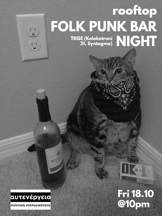 Μπαρ οικονομικής ενίσχυσης της πολιτικής συλλογικότητας "Αυτενέργεια" την Παρασκευή 18/10 στις 10μμ στην ταράτσα του Τρισέ (Κολοκοτρώνη 31, Σύνταγμα).