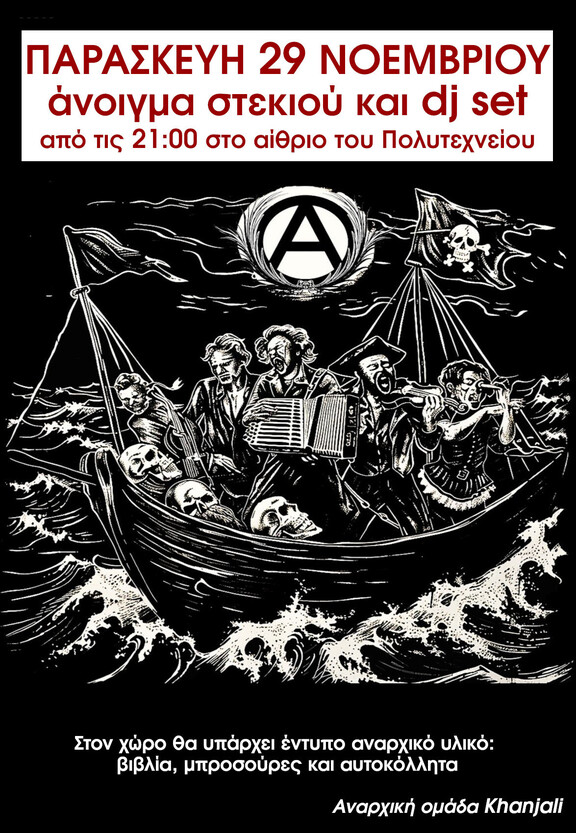 Την Παρασκευή 29/11/24 στις 21:00,στο αίθριο του Πολυτεχνείου, ανοίγουμε το στέκι Revolt όπου θα ακολουθήσει μπαρ. Στον χώρο θα υπάρχει έντυπο αναρχικό υλικό(βιβλία και μπροσούρες όπως και αυτοκόλλητα )