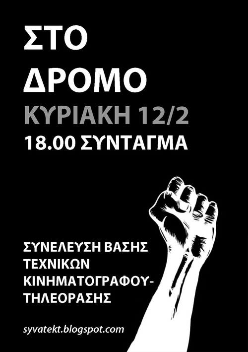 - Πέμπτη 9/2 Συλλαλητήριο, συγκέντρωση στα Προπύλαια στις 6.00 μμ. Να γίνει αυτό η αρχή για καθημερινή κάθοδο στις πλατείες και στο Σύνταγμα. Για την οργάνωση του αγώνα καλούμε συνδικάτα, λαϊκές συνελεύσεις, επιτροπές αγώνα και κάθε αγωνιζόμενο, σε σύσκεψη την Πέμπτη, αμέσως μετά το συλλαλητήριο στις 8 μμ στην ΟΛΜΕ (Κορνάρου 2 και Ερμού)