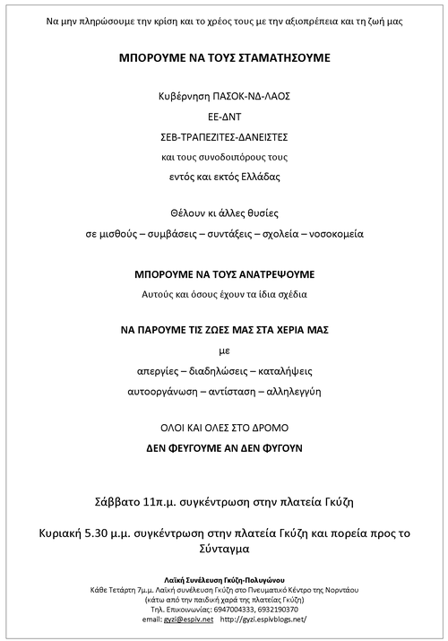 - Καλούμε Κυριακή 12/2 στο Σύνταγμα στις 6.00, και στις πλατείες σε όλη την Ελλάδα καλούμε τα συνδικάτα, τις λαϊκές συνελεύσεις, τους εργαζόμενους, τους ανέργους, τη νεολαία, όλο το λαό σε μια μεγάλη συγκέντρωση
