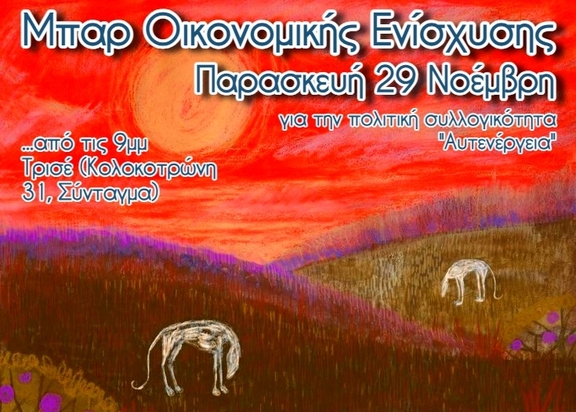 Μπαρ οικονομικής ενίσχυσης της πολιτικής συλλογικότητας "Αυτενέρεγεια" στο Τρισέ (Κολοκοτρώνη 31, Σύνταγμα)