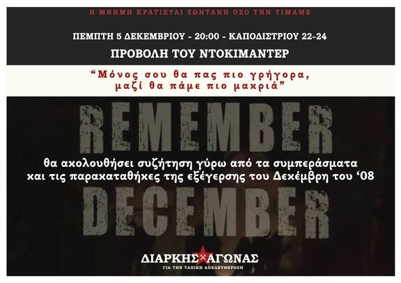 Την Πέμπτη 5 Δεκέμβρη, στο χώρο του "Διαρκή Αγώνα για την ταξική απελευθέρωση", στα Εξάρχεια (Καποδιστρίου 22-24), θα πραγματοποιηθεί η προβολή του ντοκιμαντέρ για την εξέγερση του Δεκέμβρη του '08, "Μόνος σου θα πας πιο γρήγορα, μαζί θα πάμε πιο μακριά".
