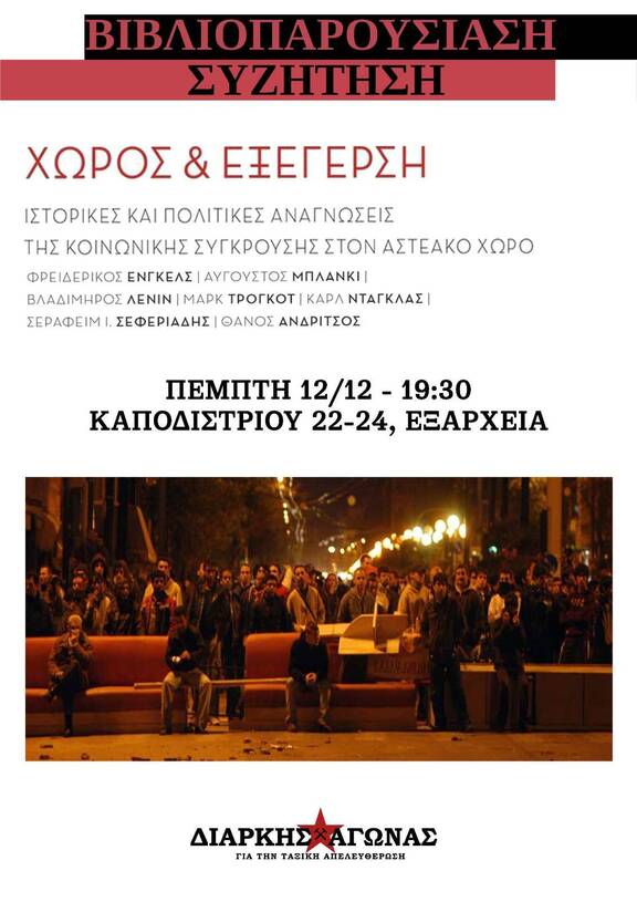 Την Πέμπτη 12 Δεκεμβρίου στις 19:30 στον πολιτικό χώρο του "Διαρκή Αγώνα για την ταξική απελευθέρωση" στην Αθήνα (Καποδιστρίου 22-24), θα γίνει παρουσίαση του βιβλίου «ΧΩΡΟΣ & ΕΞΕΓΕΡΣΗ - ΙΣΤΟΡΙΚΕΣ ΚΑΙ ΠΟΛΙΤΙΚΕΣ ΑΝΑΓΝΩΣΕΙΣ ΤΗΣ ΚΟΙΝΩΝΙΚΗΣ ΣΥΓΚΡΟΥΣΗΣ ΣΤΟΝ ΑΣΤΕΑΚΟ ΧΩΡΟ» & θα ακολουθήσει συζήτηση.
