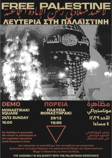 Επιλέγουμε να σπάσουμε την κανονικότητα του εορταστικού κλίματος και να βγούμε στους δρόμους να διαδηλώσουμε αλληλέγγυα στα αδέρφια μας στην Παλαιστίνη.
