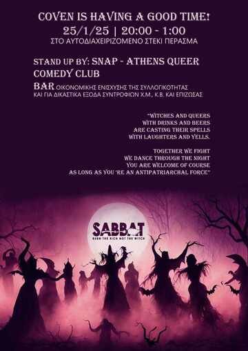 Η φεμινιστική συλλογικότητα Sabbat - Burn the Rich not the Witch κάνει BAR & Stand Up για την οικονομική της ενίσχυσης με την βοήθεια του SNAP - Athens Queer Comedy Club.