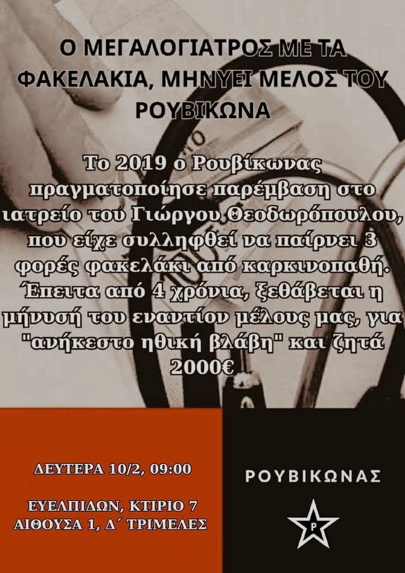 Ανακοίνωση για τη δίκη μέλους μας, έπειτα από μήνυση του φακελάκια γιατρού Γιώργου Θεοδωρόπουλου.