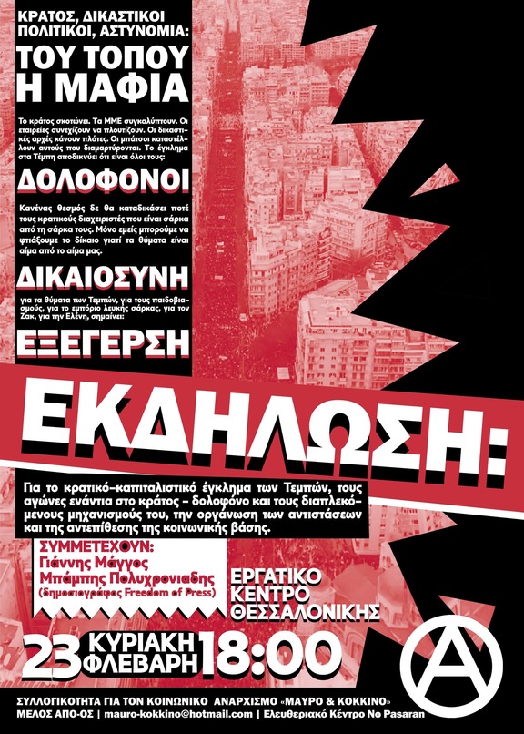 Εκδήλωση: για το κρατικό - καπιταλιστικό έγκλημα των Τεμπων, τους αγώνες ενάντια στο κράτος - δολοφόνο και τους διαπλεκόμενους μηχανισμούς του, την οργάνωση των αντιστάσεων και της αντεπίθεσης της κοινωνικής βάσης
