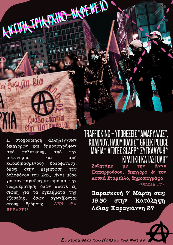 Η στοχοποίηση αλληλέγγυων δικηγόρων και δημοσιογράφων από πολιτικούς, από την αστυνομία και από καταδικασμένους δολοφόνους, όπως στην περίπτωση του δολοφόνου του Ζακ, είναι μέσο για τον παραδειγματισμό και την τρομοκράτηση όσων σπάνε τη σιωπή για τα εγκλήματα της εξουσίας, όσων αγωνίζονται στους δρόμους... ΔΕΝ ΘΑ ΠΕΡΑΣΕΙ!