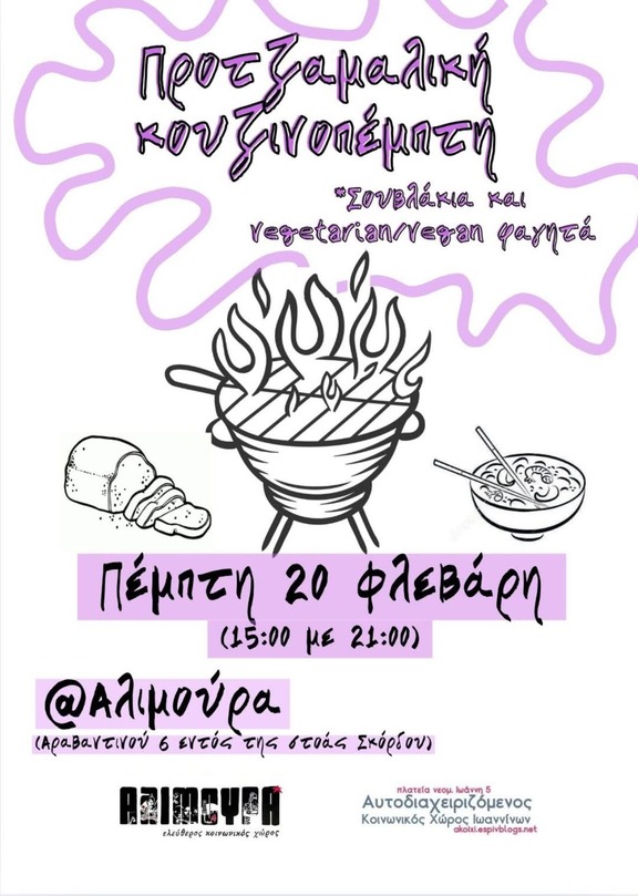 Προτζαμαλική κουζινοπέμπτη, στην Αλιμούρα με σουβλάκια, vegan/vegetarian φαγητά και μουσικούλα. Μια γεύση γλεντιού πριν τις Τζαμάλες. Αυστηρά λήξη στις 21.00.