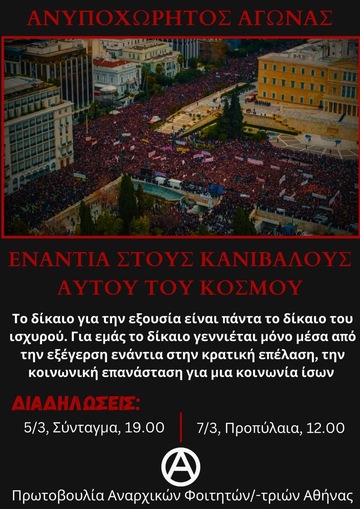 Η γενική απεργία στις 28 Φλεβάρη του 2025 ανέδειξε το μέγεθος και τη δυναμική της κοινωνικής οργής που αναμοχλεύονταν τα τελευταία δύο χρόνια, αλλά αδυνατούσε να βρει υλικό τρόπο έκφρασης στον δρόμο. Μια οργή που τα αίτια γέννησής της δεν βρίσκονται μόνο στο ίδιο το έγκλημα των Τεμπών, αλλά στη σταθερή και θεσπισμένη ασυδοσία που έχουν επιβάλει διαχρονικά το Κράτος και το Κεφάλαιο, έχοντας να υποσχεθούν μονάχα μια συνεχή συγκάλυψη των εγκλημάτων των εξουσιαστών, και μια όλο και σκληρότερη αντιμετώπιση των εξουσιαζόμενων. Από τις δολοφονίες του Βασίλη Μάγγου, του Αλέξανδρου Γρηγορόπουλου, των Ρομά Σαμπάνη, Μιχαλόπουλο, και Φραγκούλη, μέχρι τα εγκλήματα στο Μάτι, στην Πύλο και στα Τέμπη, το Κράτος και το Κεφάλαιο σκοτώνουν και η "δικαιοσύνη" τους δρα επικουρικά για να κατευνάσει την κοινωνική οργή, υποσχόμενη μια πλασματική απόδοση ευθυνών, ενώ ταυτόχρονα κρύβει τις βαθύτερες αιτίες των εκάστοτε εγκλημάτων.