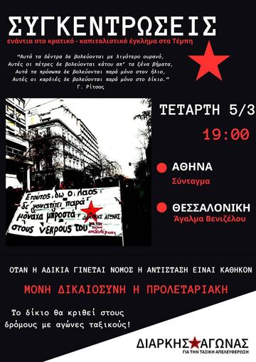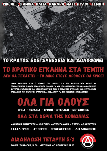 Κάλεσμα στις πανελλαδικές συγκεντρώσεις την Τετάρτη 5/3 στις 19:00 ενάντια στη συγκάλυψη και την ατιμωρησία για το κρατικό - καπιταλιστικό έγκλημα στα Τέμπη [Θεσσαλονίκη: Άγαλμα Βενιζέλου & Αθήνα: Σύνταγμα]