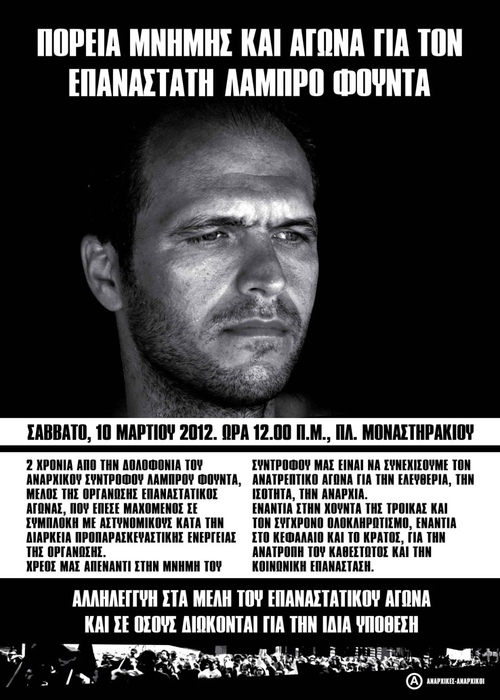 2 χρόνια από την δολοφονία του αναρχικού συντρόφου Λάμπρου Φούντα μέλους του Επαναστατικού Αγώνα που έπεσε μαχόμενος σε προπαρασκευαστική ενέργεια της οργάνωσης.