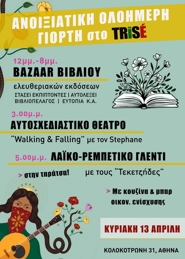 Σας προσκαλούμε στην ανοιξιάτικη ολοήμερη γιορτή στο TRISE με ρεμπέτικο γλέντι, bazaar βιβλίου, θέατρο, φαγητό και ανοιξιάτικη διάθεση!