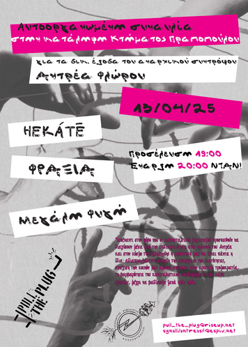 Την Κυριακή 13 Απριλίου η συνέλευση αλληλεγγύης για τον αναρχικό Αντρέα Φλώρο και η αυτοοργανωμένη συναυλιακή ομάδα pull the plug συνδιοργανώνουν live οικονομικής ενίσχυσης με τις HΕΚΑΤΕ, τους ΦΡΑΞΙΑ και ΜΕΓΑΛΗ ΦΥΓΗ στην κατάληψη του κτήματος Πραποπούλου για τα δικαστικά έξοδα του αναρχικού συντρόφου Αντρέα Φλώρου (έναρξη δίκης: 16/05).