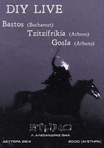 Την Δευτέρα 28/4 αυτοοργανώνουμε ένα diy live μαζί με τους Bastos από Βουκουρέστι, Tzitzifrikia και Gosla από Αθήνα, στο γνωστό υπόγειο της Λ. Αλεξάνδρας 194Α.