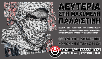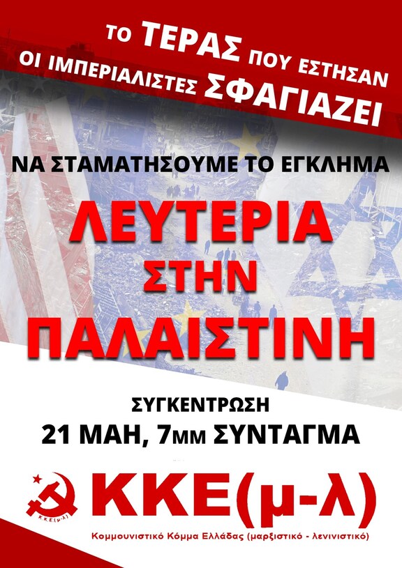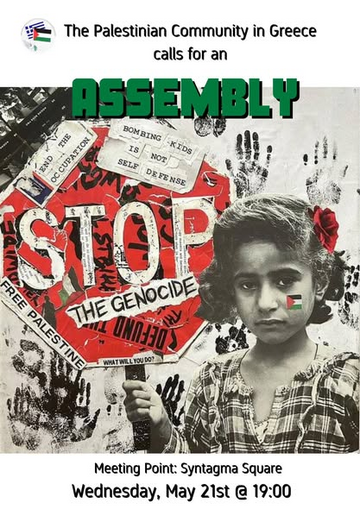 Πρωτοβουλία Συλλογικοτήτων / Ομάδων ενάντια στη συμμετοχή του ελληνικού κεφαλαίου στη Γενοκτονία του Παλαιστινιακού Λαού | Κάλεσμα στην συγκέντρωση στην πλατεία Συντάγματος την Τετάρτη 21 Μαίου στις 7μμ.