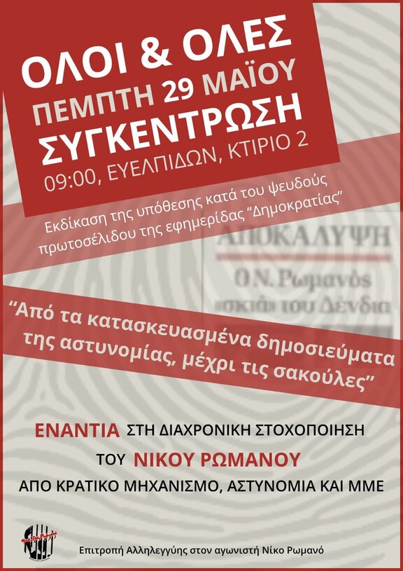 Την Πέμπτη 29 Μαΐου θα πραγματοποιηθεί το δικαστήριο για την μήνυση που είχε καταθέσει ο αγωνιστής Νίκος Ρωμανός για συκοφαντική δυσφήμιση στην εφημερίδα «Δημοκρατία» για το πρωτοσέλιδό της, σύμφωνα με το οποίο τον κατηγορούσε πως παρακολουθούσε τον Υπουργό Εξωτερικών Νίκο Δένδια στο Σύνταγμα στις αρχές Δεκεμβρίου του 2019, λίγες ημέρες πριν την επέτειο της δολοφονίας του 15 χρονου αναρχικού μαθητή Αλέξανδρου Γρηγορόπουλου και μόλις 5 μήνες από την αποφυλάκισή του.