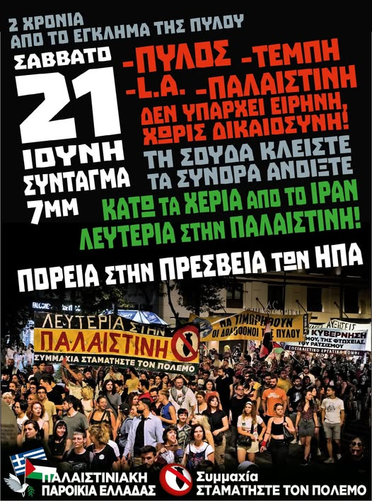 2 xρόνια από το έγκλημα της Πύλου. Συλλαλητήριο, Σάββατο 21 Ιούνη, Σύνταγμα, 7 μ.μ. Στη φυλακή οι δολοφόνοι της Πύλου. Δίκη-καταδίκη στο Ναυτοδικείο. Σύνορα ανοιχτά για την προσφυγιά.
