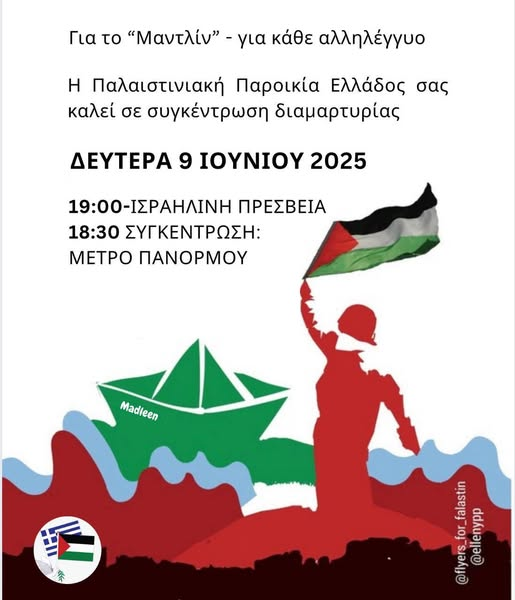 Όλοι/ες στη σημερινή συγκέντρωση στην ισραηλινή πρεσβεία σε αλληλεγγύη με τους συλληφθέντες και συλληφθείσες του ιστιοφόρου του στόλου ελευθερίας "Madleen".