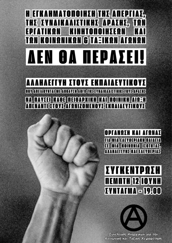 Η Ανοιχτή Συνέλευση Αγώνα ενάντια στις Συνδικαλιστικές Διώξεις και Απολύσεις καλεί την Πέμπτη 12 Ιούνη στις 7.00 μμ στο Σύνταγμα σε συγκέντρωση καταγγελίας των διώξεων και απολύσεων, της επίθεσης της αξιολόγησης και του νέου νόμου για τα πειθαρχικά και των σχεδίων για άρση μονιμότητας. Σωματεία, συλλογικότητες, κινήσεις γειτονιάς και φορείς συνεχίζουν στην κατεύθυνση οργάνωσης του αγώνα για να ανακληθούν όλες οι διώξεις, οι απολύσεις και τα πειθαρχικά!
