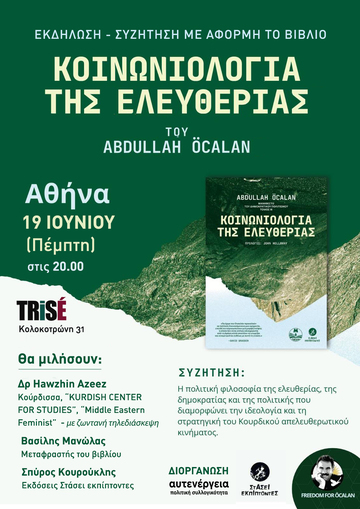 Σας προσκαλούμε στην εκδήλωση-συζήτηση με αφορμή το βιβλίο του Abdullah Öcalan, "Κοινωνιολογία της ελευθερίας", του τρίτου τόμου του Μανιφέστου του Δημοκρατικού Πολιτισμού που εκδόθηκε πρόσφατα στα ελληνικά (εκδ. Στάσει Εκπίπτοντες).
