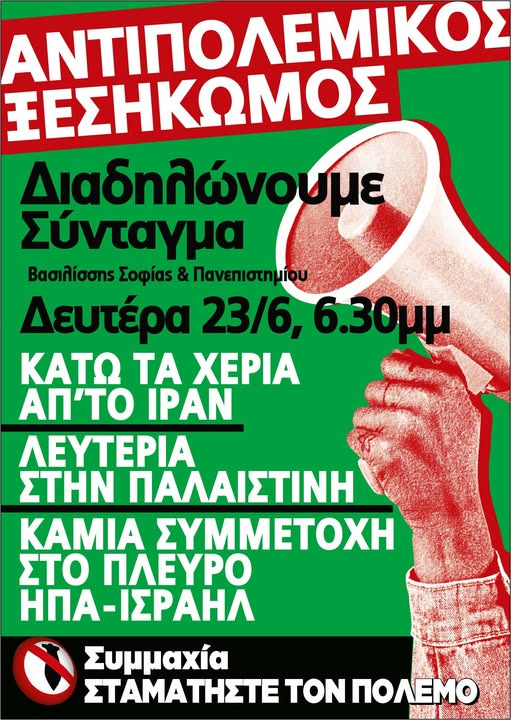• Να σταματήσουμε την επίθεση Τραμπ-Ισραήλ στο Ιράν • Λευτεριά στην Παλαιστίνη • Κάτω η κυβέρνηση του πολέμου, της φτώχειας και του ρατσισμού - Σύνταγμα 23/6, 6.30μμ