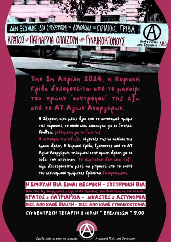 Την 1η Απρίλη 2024, η Κυριακή Γρίβα δολοφονείται από το μαχαίρι του πρώην "συντρόφου" της έξω από το ΑΤ αγ. Αναργύρων.