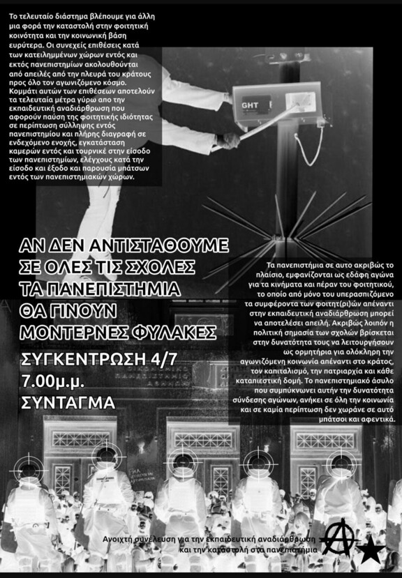 Συγκεκριμένα, η νέα κατασταλτική συνθήκη σύμφωνα με τις επιταγές Κράτους και Κεφαλαίου ήδη έχει αρχίσει να επιβάλλεται στις σχολές, συμπεριλαμβανομένης της αυστηρής επιτήρησης και της προβλεπόμενης ελεγχόμενης πρόσβασης εντός πανεπιστημίου και ό,τι αυτά συνεπάγονται (όπως κάμερες, τουρνικέ), της παρουσίας μπάτσων στο ΕΜΠ, των διαγραφών σύμφωνα με το νόμο ν+2 αλλά και, πόσο μάλλον σε περίπτωση αδικήματος εντός σχολής, των πειθαρχικών και, συνολικότερα, της πολιτικής αποστείρωσης των σχολών. Απέναντι σε όλη αυτή την επίθεση και την αναμενόμενη όξυνσή της, εμείς διεκδικούμε τις σχολές μας ως ελεύθερους δημόσιους χώρους προς όλη την κοινωνία, ως ορμητήρια και εδάφη αγώνα ενάντια στη λεηλάτηση της παιδείας, αλλά και ευρύτερα σε Κράτος, καπιταλισμό, πατριαρχία και κάθε εξουσία. Συλλογικά και αυτοοργανωμένα, στέκια, ελευθεριακά σχήματα και ευρύτερα αντιεξουσιαστικές πρωτοβουλίες εντός σχολών καλούμε ως ανοιχτή συνέλευση ενάντια στην εκπαιδευτική αναδιάθρωση και την καταστολή στα πανεπιστήμια σε στήριξη της συγκέντρωσης και συμμετοχή στον αγώνα μας, για να γίνουν τα πανεπιστήμια που ονειρεύονται οι χειρότεροί τους εφιάλτες.