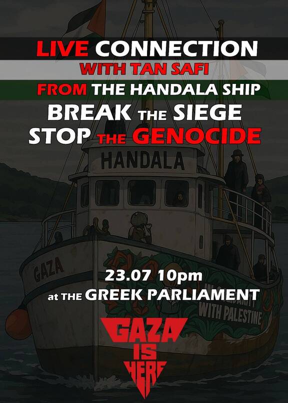 Εμείς, άνθρωποι από την Παλαιστίνη, ντόπιοι και από όλο τον κόσμο, οργανώσαμε αυτή τη διαμαρτυρία μπροστά από το ελληνικό κοινοβούλιο ως μια ειρηνική αλλά επείγουσα πράξη αντίστασης. Στεκόμαστε ενάντια στη συνεχή γενοκτονία που εκτυλίσσεται στη Γάζα και στην πολιτική υποκρισία που την επιτρέπει. Εδώ και 32 συνεχόμενες ημέρες διαδηλώνουμε εδώ με σαφή αιτήματα να σταματήσει η δυστυχία του λαού μας στη Γάζα και, να σταματήσει η συνενοχή του ελληνικού κράτους και να ξεκινήσουν οι διώξεις κατά των Σιωνιστών εγκληματιών πολέμου που εισέρχονται στο ελληνικό έδαφος. Οι ακτιβιστές του Συνασπισμού του Στόλου της Ελευθερίας που επιβαίνουν στο πλοίο «Handala» πλέουν για να σπάσουν τον διαρκή σιωνιστικό αποκλεισμό της Γάζας. Αντιμετωπίζουν εκφοβισμό από ένα κράτος που έχει παραβιάσει το διεθνές δίκαιο με κάθε δυνατό τρόπο με απόλυτη ατιμωρησία, από τη γενοκτονία των Παλαιστινίων μέχρι την παράνομη ενέδρα και την απαγωγή των 12 ακτιβιστών που επέβαιναν στο «Madleen» μόλις τον περασμένο μήνα. Η κατάσταση σε όλη την Παλαιστίνη είναι τραγική. Μέχρι σήμερα, περισσότεροι από 60.000 Παλαιστίνιοι έχουν σκοτωθεί στη Γάζα. Οι βομβαρδισμοί των γειτονιών είναι αμείλικτοι και η πείνα εξαπλώνεται στη Γάζα καθώς η Σιωνιστική οντότητα συνεχίζει να αποκλείει την είσοδο τροφίμων, νερού και φαρμάκων. Εν τω μεταξύ, ο σιωνιστικός κατοχικός στρατός σφαγιάζει βάρβαρα τους Παλαιστίνιους στους χρηματοδοτούμενους από τις ΗΠΑ χώρους διανομής «ανθρωπιστικού» ιδρύματος στη Γάζα. Πάνω από 800 άνθρωποι έχουν δολοφονηθεί προσπαθώντας να εξασφαλίσουν τρόφιμα για τις οικογένειές τους από τον Μάιο. Το «Handala» μεταφέρει επισιτιστική βοήθεια και κρίσιμες ιατρικές προμήθειες στη Γάζα, με πρόθεση να δημιουργήσει έναν ανθρωπιστικό διάδρομο. Η ελληνική κυβέρνηση συμμετέχει ενεργά στη γενοκτονία: σιωνιστικά πλοία ανεφοδιάζονται στο λιμάνι του Πειραιά. Οι ελληνικές αγορές είναι γεμάτες από σιωνιστικά προϊόντα. Το ελληνικό έδαφος φιλοξενεί στρατιωτικές βάσεις του μεγαλύτερου αρωγού της Σιωνιστικής Οντότητας, των Ηνωμένων Πολιτειών. Ο ελληνικός στρατός συνεργάζεται με τις σιωνιστικές δυνάμεις κατοχής, πραγματοποιώντας κοινές ασκήσεις και ανταλλάσσοντας όπλα αξίας δισεκατομμυρίων ευρώ. Η ελληνική κυβέρνηση και η Σιωνιστική Οντότητα έχουν υπογράψει συμφωνία κοινής αγοράς για την κατασκευή του δικού της «Σιδηρού Θόλου» της Ελλάδας στα θαλάσσια σύνορα με την Τουρκία, με κόστος 2 δισεκατομμύρια ευρώ. Η ελληνική κυβέρνηση εξακολουθεί να επενδύει βαθιά στα σιωνιστικά ακίνητα και στον τουρισμό. Η ελληνική αστυνομία χρησιμοποιεί σιωνιστική τεχνολογία για να παρακολουθεί και να καταστέλλει τα κινήματα και τον λαό μας. Ο προσφυγικός καταυλισμός της Σάμου χρησιμοποιεί συστήματα ασφαλείας που έχουν αγοραστεί από τη σιωνιστική οντότητα. Η ελληνική ακτοφυλακή χρησιμοποιεί μη επανδρωμένα αεροσκάφη «Heron» στον πόλεμο κατά των μεταναστών, εμποδίζοντας τις προσφυγικές λέμβους να εισέλθουν στα ελληνικά ύδατα, ακόμη και όταν τα σιωνιστικά πλοία περνούν ελεύθερα. Είμαστε εδώ σε αλληλεγγύη με τη Γάζα και σε αλληλεγγύη με τις προσπάθειες του Συνασπισμού του Στόλου της Ελευθερίας να σπάσει την πολιορκία. Η πρωτοβουλία «Gaza is Here» συνεχίζει έτσι τη συνεργασία της με την FFC. Ο Thiago Avila μοιράστηκε μαζί μας την εμπειρία του στο «Madleen» νωρίτερα αυτό το μήνα. Επεκτείνουμε επίσης την υποστήριξή μας σε άλ