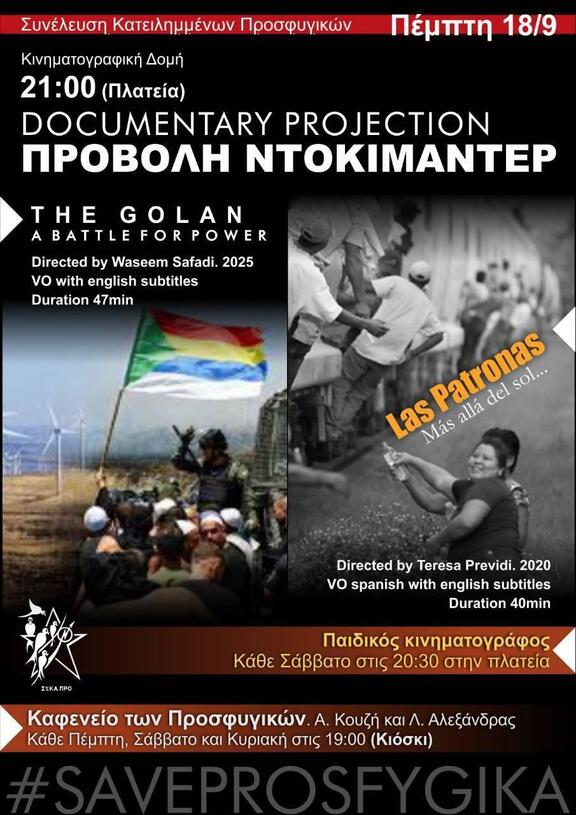 Την Πέμπτη 18/9 στις 21:00 στην Πλατεία των Προσφυγικών (Κούζη & Βεγορίτιδος) θα προβληθούν τα ντοκιμαντέρ "The Golan: A Battle For Power" (σκηνοθετημένο απο τον Waseem Safadi το 2025, με αγγλικούς υποτίτλους και διάρκεια 47 λεπτά) και "Las Patronas" (σκηνοθετημένο απο την Teresa Previdi το 2020, με αγγλικούς υποτίτλους και διάρκεια 40 λεπτά).
