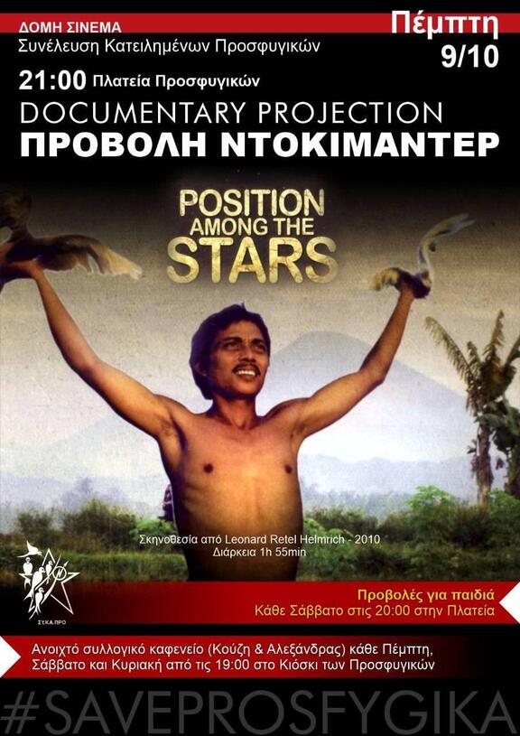 Την Πέμπτη 9/10 στις 21:00 στην Πλατεία των Προσφυγικών (Κούζη & Βεγορίτιδος) θα προβληθεί το ντοκιμαντέρ "Position among the stars", σκηνοθετημένο απο τον Leonard Retel Helmrich το 2010. Το ντοκιμαντέρ έχει αγγλικούς υποτίτλους και διάρκεια 1 ώρα και 55 λεπτά.