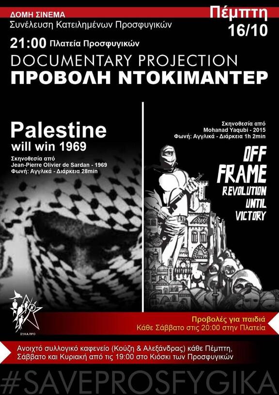 Την Πέμπτη 16/10 στις 21:00 στην Πλατεία των Προσφυγικών (Κούζη & Βεγορίτιδος) θα προβληθούν τα ντοκιμαντέρ "Palestine will win" & "Off Frame AKA Revolution Until Victory".
